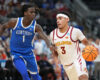 Florida’s Boogie Fland was driving to the basket with 1:10 remaining and a three-point lead over Iowa when Hawkeyes forward Cooper Koch stepped into the lane, swatted at the ball and it sailed out of bounds. Officials ruled it Florida’s ball.